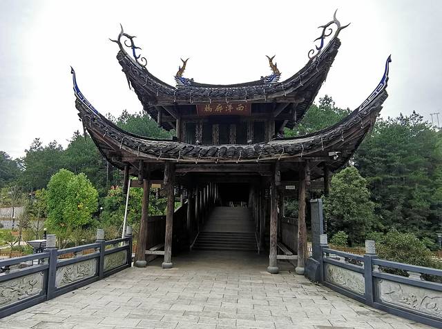 桥为二层重檐楼阁,内有木梯可以上下,屋面回翼角高翘,造型雅朴,是县境内优美的古代木廊平桥