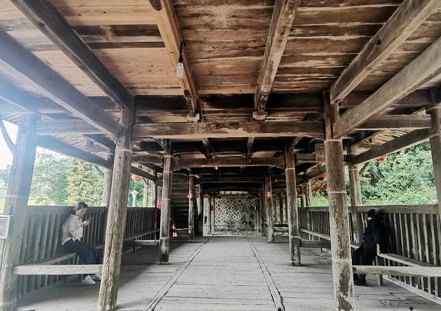 与其他廊桥不同,文重桥底下是几百吨重的石墩,承载着溪水的流淌,木结构的桥身是平直的,在大山溪水之上显得小巧而精致
