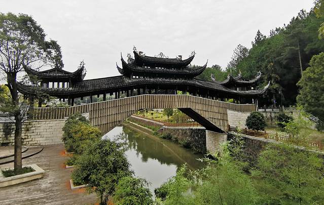 薛宅桥,横跨锦溪,又称锦溪桥,叠梁式木拱廊桥,全长51米,宽5.1米,单跨29米,离水面10.5米,桥头坡度大,造型古朴独特,气势雄伟壮观