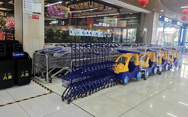 旁边的人本超市里,童用购物车与“哄娃购物两不误”车相当的人性化