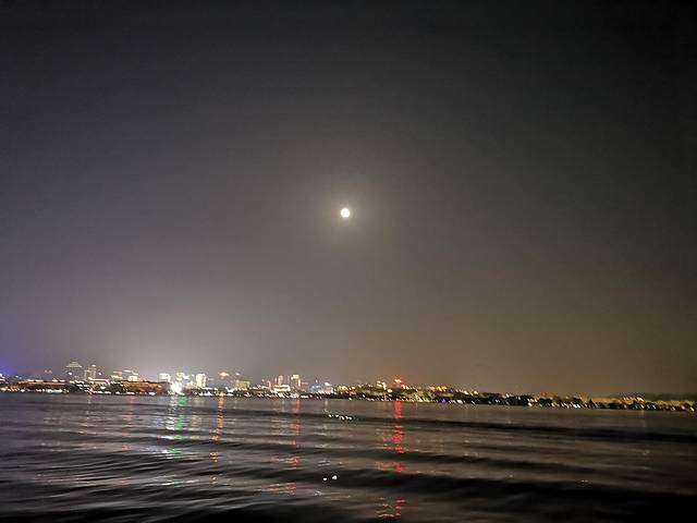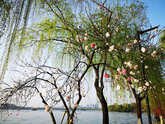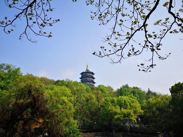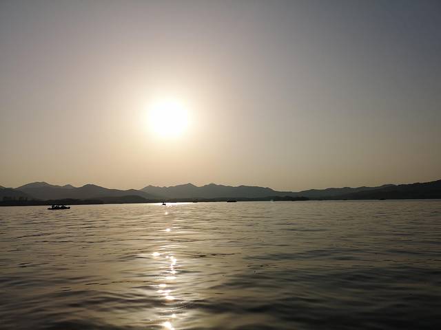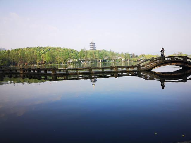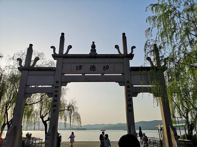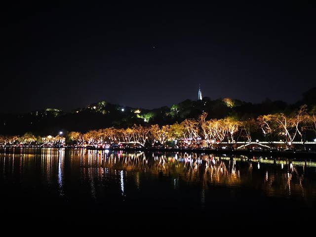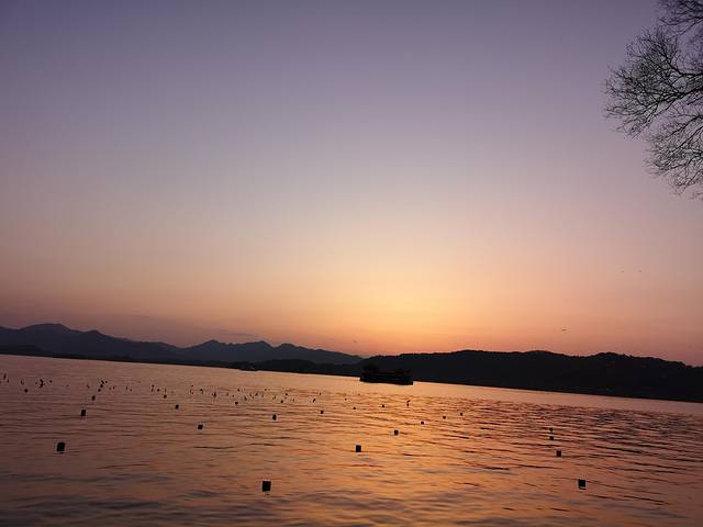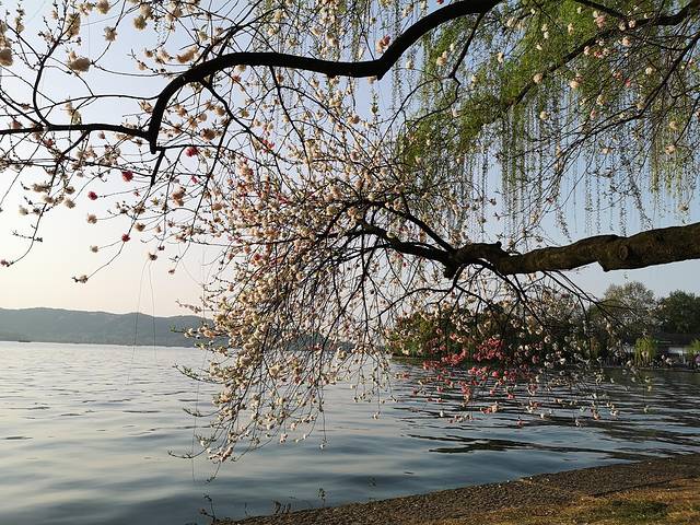 镶嵌在杭州城中的一块宝石便是西湖,可谓“欲把西湖比西子,浓妆淡抹总相宜”,不知是何等的荣增,阳光明媚下的西湖与烟雨朦胧的西湖居然被我都揽于眼底,原本想参加一个当地团去听听关于西湖更多的故事,但自觉还是用自己的初心去感受那份闲散中的从容,湖畔的樱花红、白、粉相间,在绿叶的衬托下,红的惊艳,白的淡雅、粉的羞涩,白天的西湖亮丽而秀美,晚上的西湖多彩而深邃。这天的月亮圆的不亚于圆规作图,平视为五彩灯光倒映的西湖,微提眼帘是被灯光照的通亮的樱花与垂柳,再抬眼望去是一轮“白月盘”点亮的天空,我再次为自己偶遇这难得的美景而庆幸,我是何等的有幸。烟雨中的西湖需要一把伞,从远处取景又是何等意境。