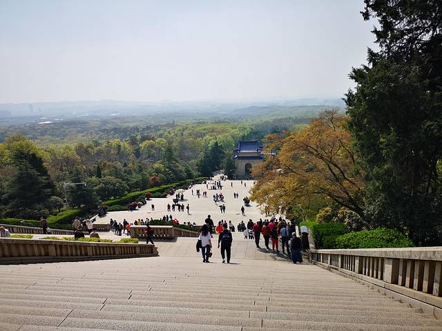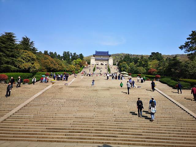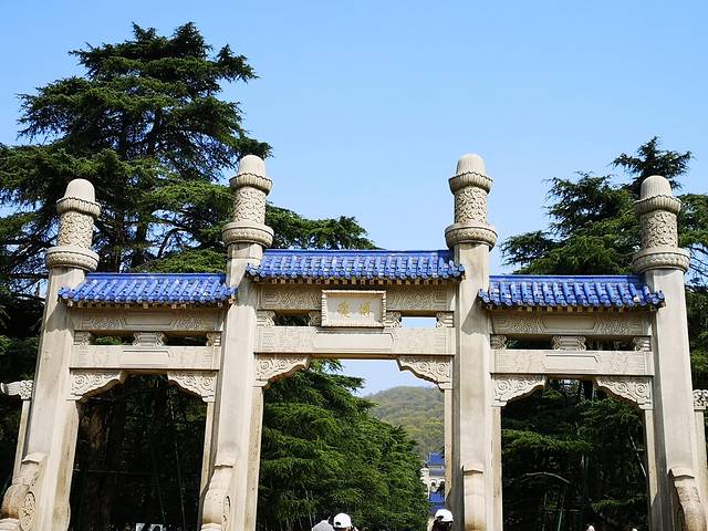 中山陵前临平川,背拥青嶂,东毗灵谷寺,西邻明孝陵,整个建筑群依山势而建,由南往北沿中轴线逐渐升高,主要建筑有博爱坊、墓道、陵门、石阶、碑亭、祭堂和墓室等,排列在一条中轴线上,体现了中国传统建筑的风格,从空中往下看,像一座平卧在绿绒毯上的“自由钟”。青顶寓意青天白日