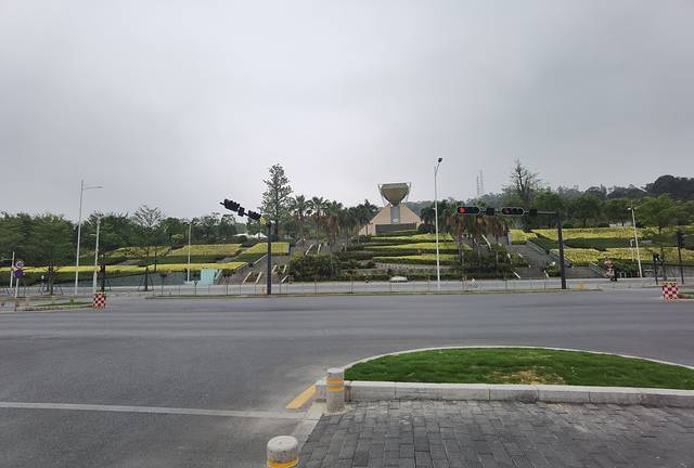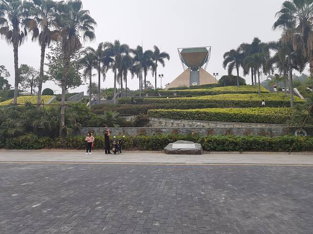 越过凤凰大道,登上台阶就是公园的迎宾广场了。宽阔的广场全由大理石铺成,正中的钻石塔是那样的雄伟。金字塔的两旁各有一棵参天古木,像两个卫士一样日夜守护着钻石塔。