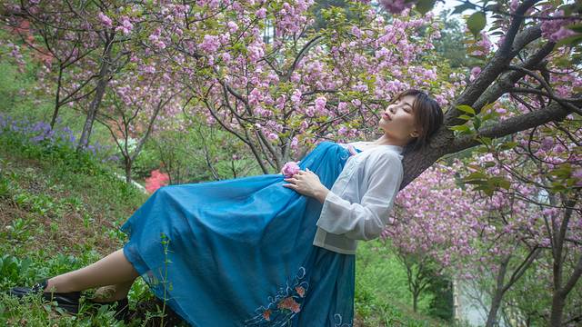 这处风景规模不大,但是却很有意境,歪歪斜斜的桃树长在卵石丛中,树枝甚至垂落在湖面上。看到如此美景,同行的模特小姐姐忍不住摆出各种好看的姿势,留下一张张绝美的倩影。