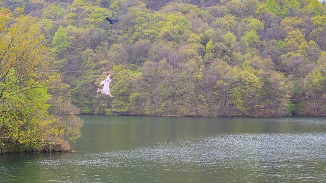 顾名思义,就是吊上影视剧里威亚,飞翔在天池湖面上,摆出一个又一个帅气潇洒的姿势,像极了武侠小说里的绝代宗师。