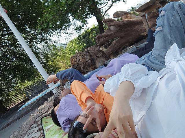 在一个停车场等朋友上完课去玩,因为太阳有点大所以我们在树荫下躺着