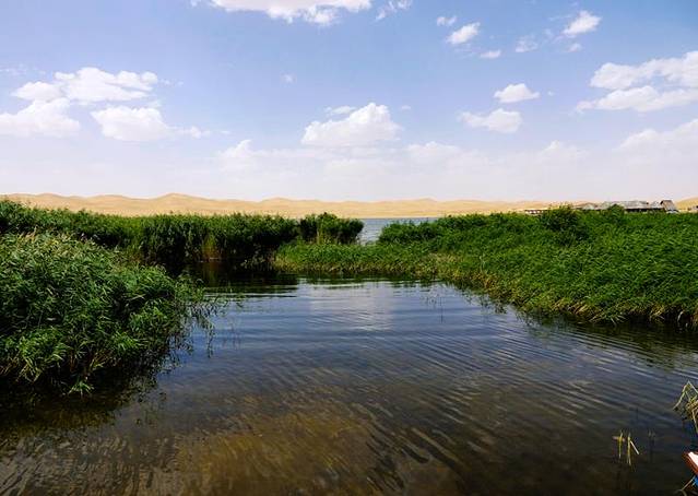 介绍完后,就引领我们走进芦苇丛中的木栈道。走在郁郁葱葱的芦苇丛中,看着湖光山色,很难想像这茫茫沙漠里,竟然有这样一片绿洲,这么大一个湖,与平时印象中的干涸的沙漠迥然不同。