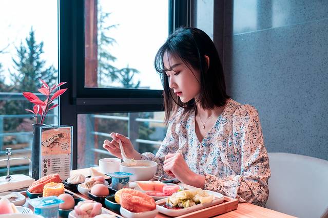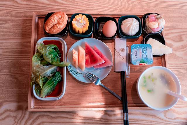 出门度假,除了睡的好以外,我还比较注重吃。酒店的悦溪餐厅就在入口旁,酒店有早餐、中餐、下午茶和晚餐。这里的早餐特别丰盛,不仅有蔬菜、鸡蛋、水果、还有酸奶和粥,粥里竟然还有海参。