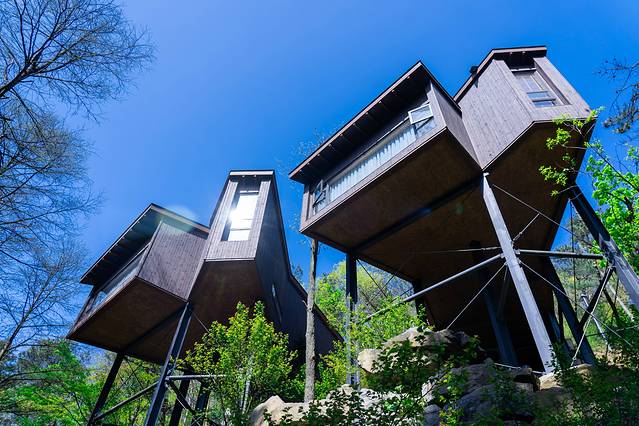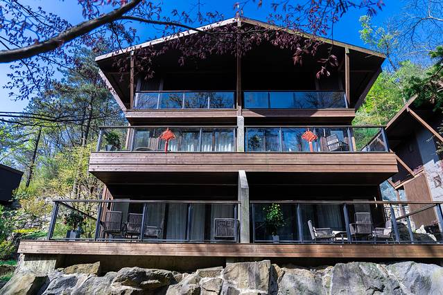 我最喜欢松月主体房,是架空的形势沿着山势悬在空中的小木屋,很有设计感有种北欧的风格。