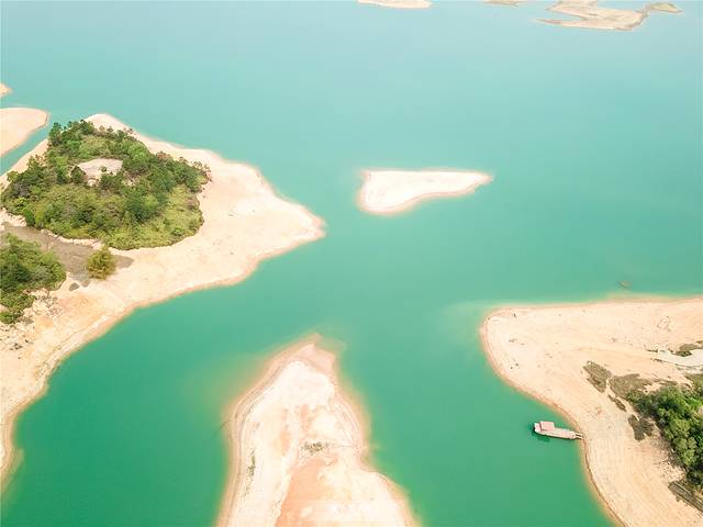碧绿色的湖水与土黄色的沙洲岛相映成趣,航拍的独特视角拍摄下,仿佛仙境一般存在。