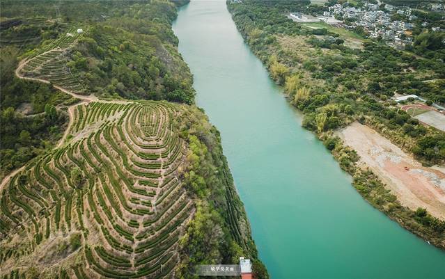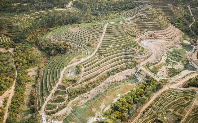 一整片绿油油的茶园很有《菊次郎的夏天》画面感,茶园规划得井井有条,从高处航拍,仿佛是大自然的手掌纹。