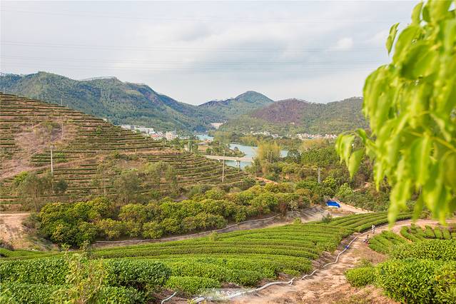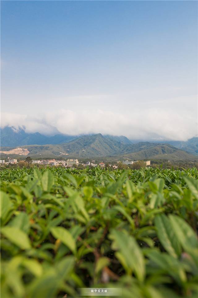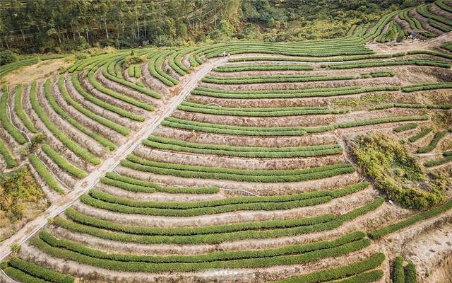 成片的茶树沿着山势蜿蜒向上,站在茶田当中,天地之间仿佛都是茶的清香、茶的风情。