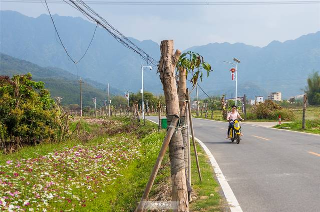 听说距离顺逸东方白盆湖温泉度假村不远处的白马村有一整片的格桑花海,午睡后我们骑着电动车就出发前往。