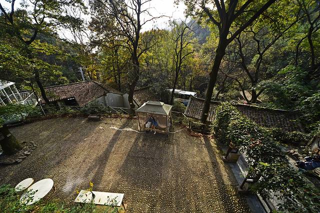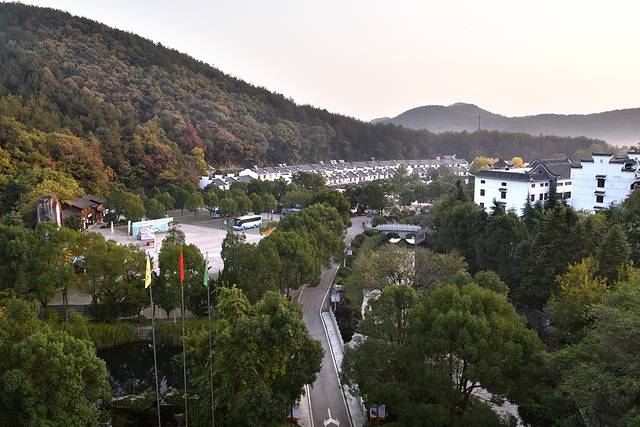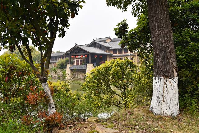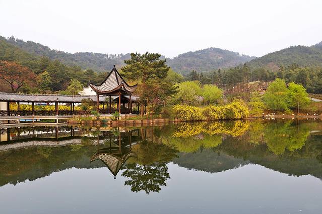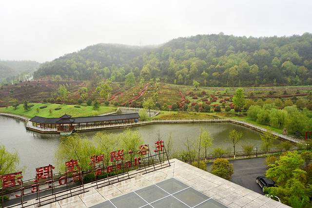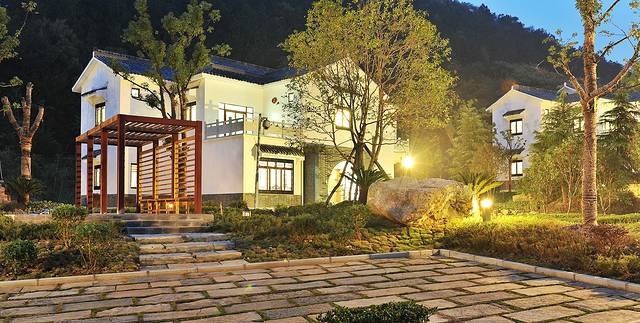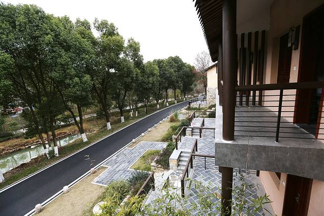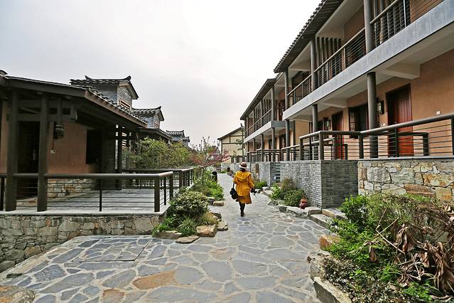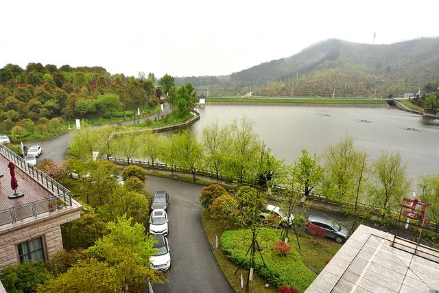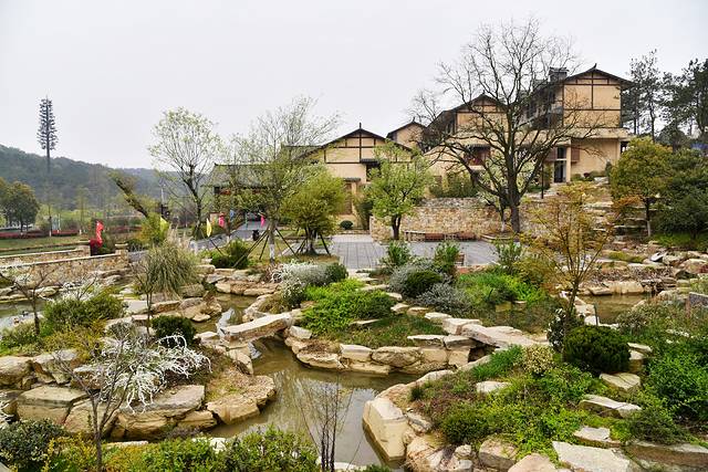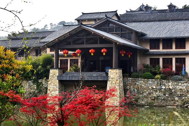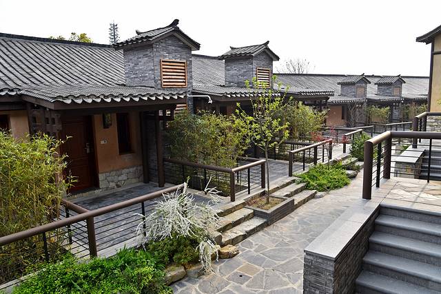 在银杏山庄度假酒店,山前水畔,一片高低错落的房子,灰瓦黄墙与周围景观和谐地融为一体。山坡上用石块和花草树木布置成一片精致的园林,小桥流水,绿树春花,清新,优雅,安逸,舒适。