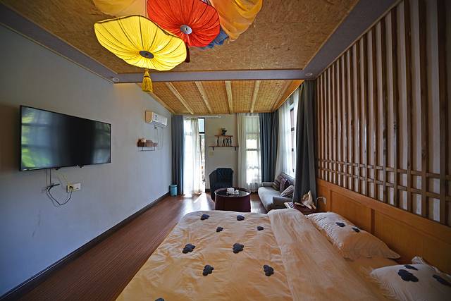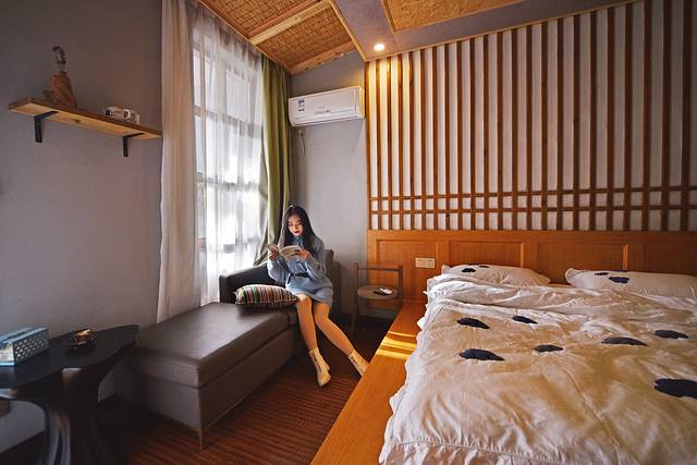 青曦·望云房间全部在二层,共有三种房型,八间客房分别取名望云、瞻星、侯月、远眺、听雨、莳花、倚竹、寻幽,均选自“人生四十大乐事”。房间里的墙面、屋顶和灯具都看得出经过了主人精心的设计,品牌床垫有软硬两面可使用,非常贴合身体的曲线,躺在上面舒服得不想起来。专门布置的儿童房有孩子们喜欢的小滑梯和海洋球池,还准备了儿童专用的洗漱用品、衣架和玩具,非常贴心。