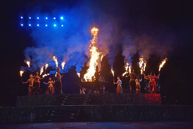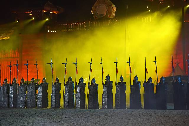 到锦里沟,一定要看一场实景演出《风云土司寨》。演出分为和谐土家族、土家联姻、土匪来袭、土司练兵、决战土司寨几个章节。以三位土司带领村民奋起反击,誓死保卫家园的故事为线索,生动地展示了一场荡气回肠的英雄之战。整个战斗中,音乐烘托气氛,打斗骑术精湛,烟火效果震撼,为观众们献上了一场精彩绝伦的演出。