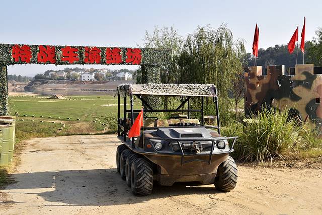 在河西军事体验区,我们看到了航母舰载机歼-15飞鲨的模型。轻盈的体态,强有力的发动机,机翼挂架上威风凛凛的导弹,在夕阳的映照下,更显英姿飒。99A坦克,武直10直升机的等比例模型,果然霸气威武。河西军事体验区有小火车、骑马、真人CS、滑索、吊桥等体验项目,还可以乘坐小坦克和特战车,做出原地360度旋转,“Z”字形大转角机动、“V”字形漂移等酷炫的动作,既刺激又过瘾。