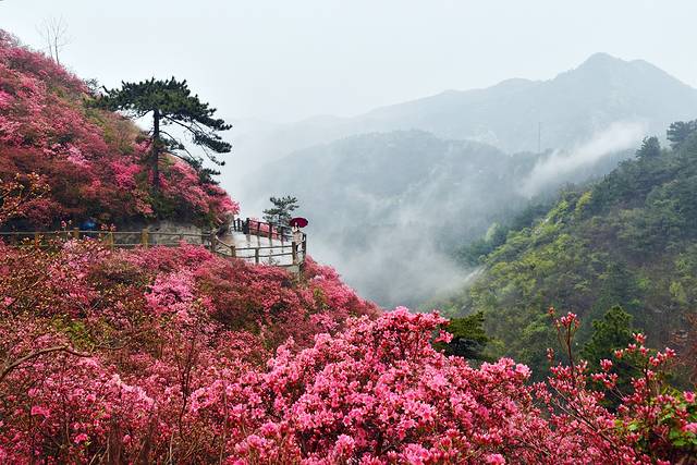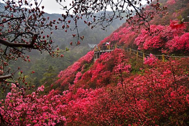 武汉黄陂木兰云雾山是春天赏杜鹃花海的好地方,每年三月末开始,漫山遍野的杜鹃花海非常壮观。花山、花海、花洋随着海拔高度不同,花期前后错落,一直持续近一个月,每天都有数以万计的游客专程前来观赏。