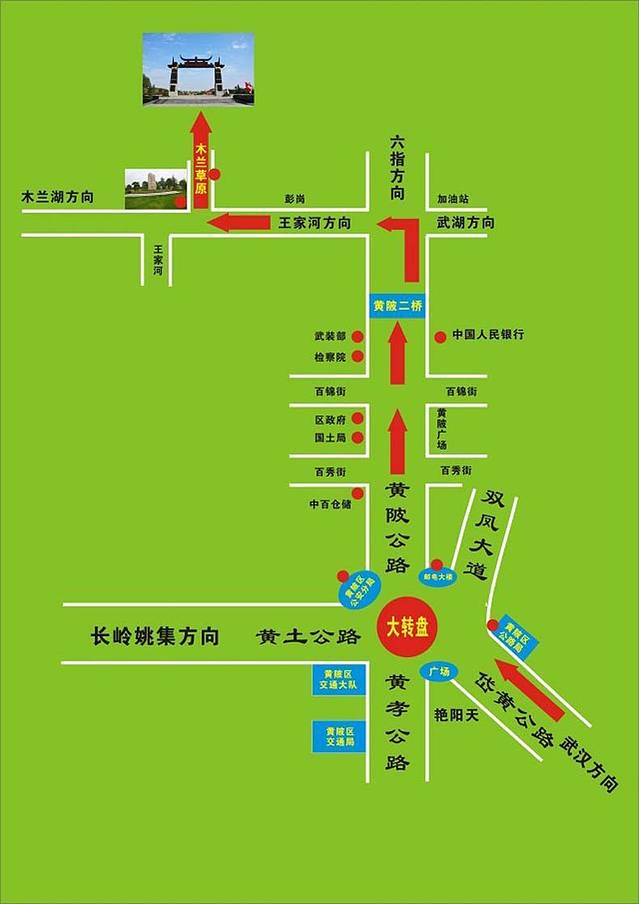 武麻高速武汉城区-黄陂转盘第二个出口黄陂大道-火塔线-木兰水镇大饭店