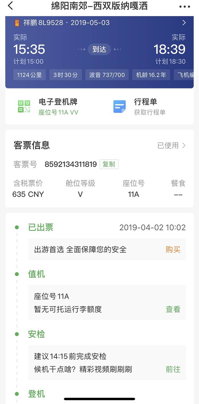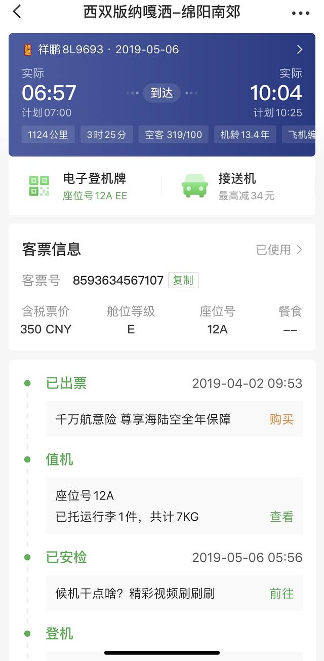 于是在2019年的五一,在对比了从成都和绵阳出发的价差以后,我和宣姑娘就从成都火车去绵阳乘飞机经停大理抵达西双版纳,去哪儿只能查到2年前的订单,刚好这一笔就查不到了,好在航旅纵横上还有飞行记录,宣姑娘说这是她第一次坐飞机难免紧张,我说我第一次自己单独坐飞机也是很紧张的,那是19年3月份从杭州返回成都,时间比较赶,狗子打车从绍兴送我到萧山机场,匆匆一拥后就转身上了等候在外的滴滴,把我一个人扔在偌大的机场(后来觉得萧山机场真是我见过最差最小的国际机场),我就开始慌慌张张地找值机柜台和安检口、登机口。