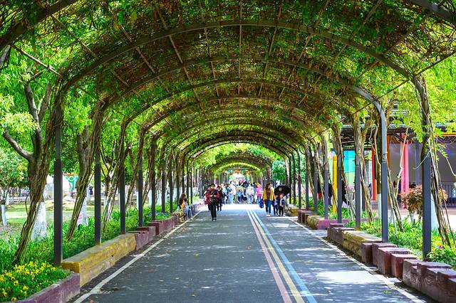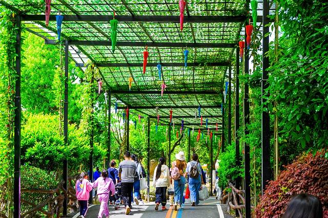 走进乐园,一条条绿色长廊出现在眼前,长廊两侧就是各种游玩项目,这种设计对于游客来说简直不要太赞,再也不怕顶着大太阳逛乐园了,游玩过还可以在绿色长廊下休憩。