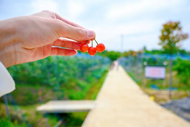 当季是采摘樱桃的最佳时节,在田园嘉乐比乐园中种植有100余亩樱桃,其品种以短柄樱桃、黑珍珠樱桃为主,樱桃个头比较大,那红彤彤的樱桃看着就让人直流口水,吃在嘴里甜中带些酸。