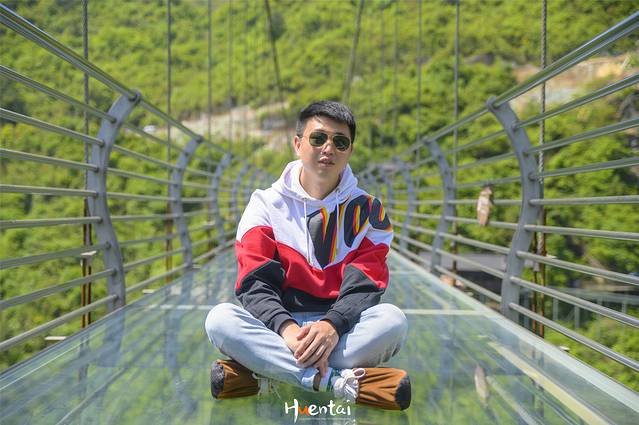 突然大风刮来,凌云天桥还会有所晃动,既刺激又害怕。但完全不用担心安全问题,稳得很!小晃动是因为天桥有300米长,相对高度可以达到150米。来到玻璃桥上必须要好好拍点照片,留个好纪念,即便有点小害怕我也要装着若我其实的样子……