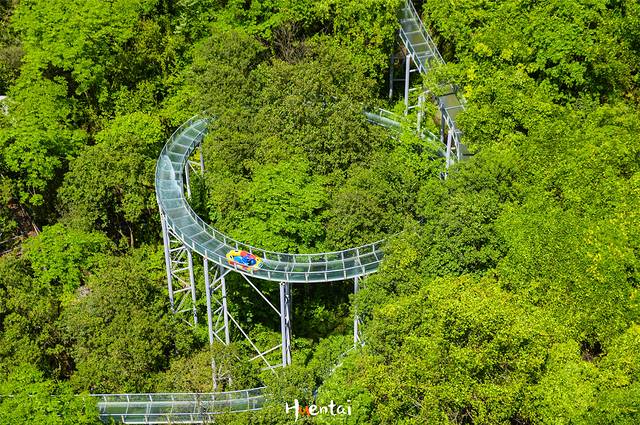 这条水滑道的全程有1350米,首尾高差可以达到120米,你算算它能给爬山节省多少体力?这么长这么刺激的玻璃漂流滑道在其它地方你还真不多见,所以值得体验。