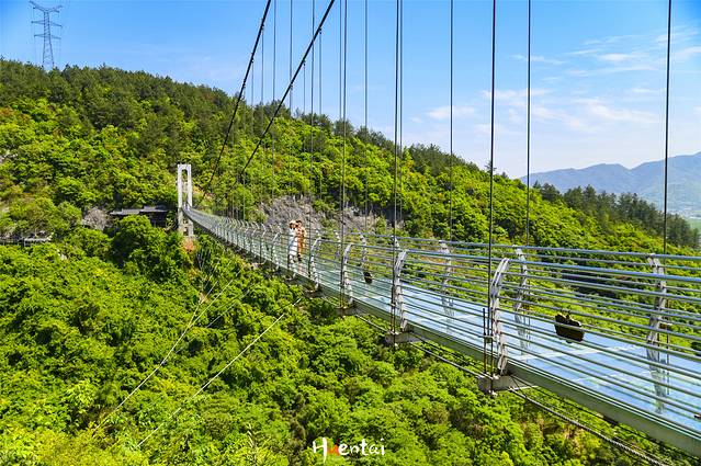 从地下河溶洞出来,步行走木质栈道后就可以来到凌云天桥。穿上鞋套就可以在玻璃桥面上大步走了,当然要在你不害怕的前提下哦。在天桥上可以俯瞰景区全貌,也可以一览桐庐的好山好水。满目苍翠,看着就让人感觉很清凉,心情大好。