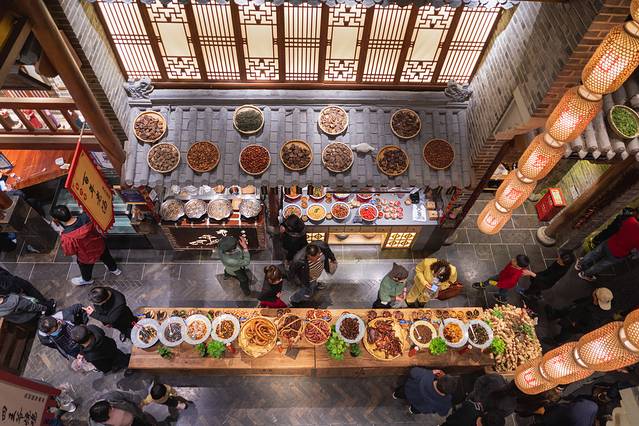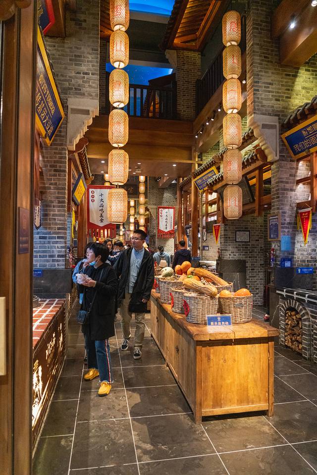 唐山饮食文化博物馆由三街两巷一条河连通,一条概念滦河贯穿其中,两条小巷穿插连通主街,乡愁作坊街、小山风情街、京东美食街、便宜街、小山大世界、姥姥家商铺、梨园盛世……街巷两旁店铺林立,街上人来人往,饭菜飘香。