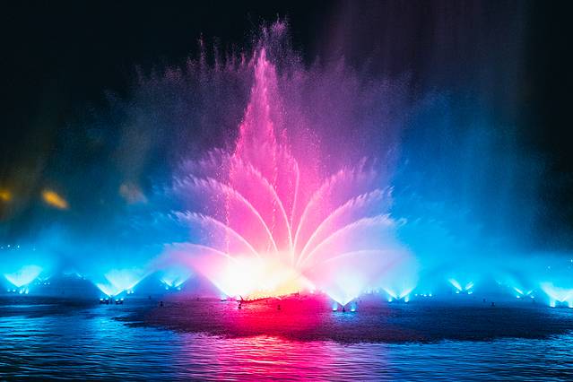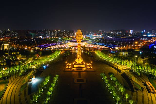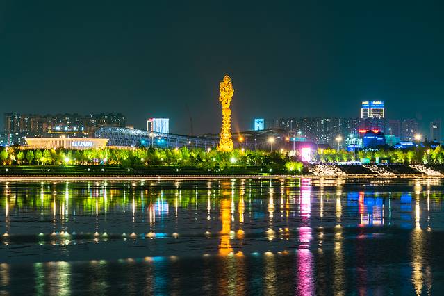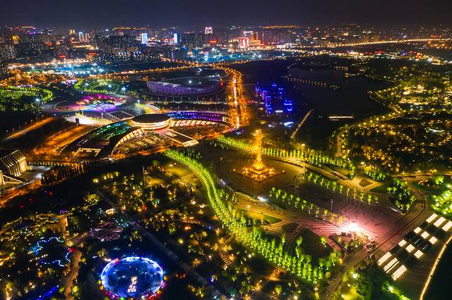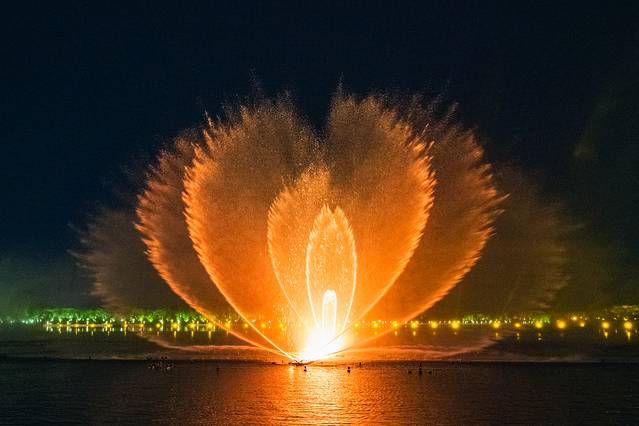 当夜幕降临,华灯初上,南湖又是另一番模样,丹凤朝阳广场,古铜色雕塑上“春夏秋冬”四季变幻。在广场南侧龙泉湾湖面上,是水精灵的秀场。长220米,宽81米的舞台上,湖水随着音乐、随着七彩的镭射光,律动摇摆,身姿扶摇变换;长卷水幕电影、艺术灯光、多变水形在高科技的助力下,为人们呈现出完美的视觉盛宴。