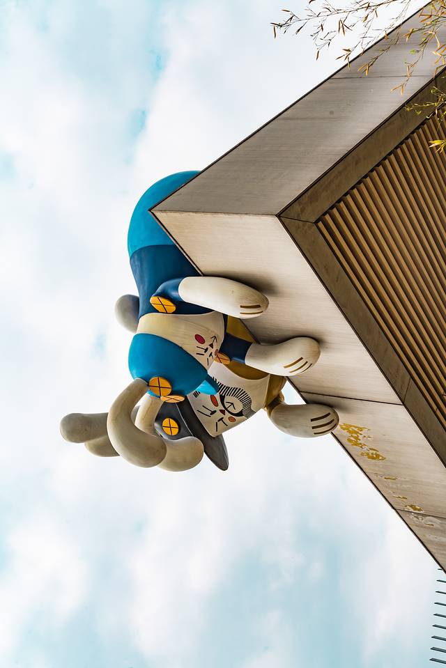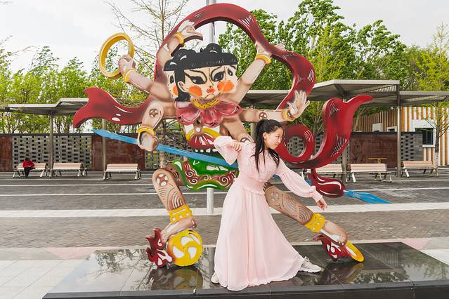 在通往皮影主题乐园的大门沿途,就可以看到各种造型的皮影形象了,孙悟空、哪吒、李小龙……那动作是有板有眼,参照卡通皮影形象,摆个同款造型的Pose,举起手机,来张合影,那是怎么看怎么合谐。