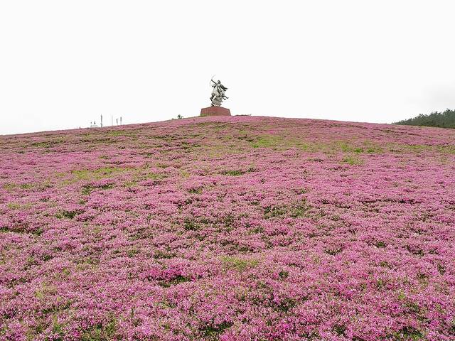 搭乘摆渡车一路风驰电掣,大约二十多分钟就抵达了观赏杜鹃花的入口。虽然下着淅淅沥沥的小雨,偶尔一阵山风拂过脸颊,真有点微冷。但是漫山遍野的杜鹃花花开正艳,一株株花团锦簇,像亭亭玉立的仙女似的,显得格外美丽。