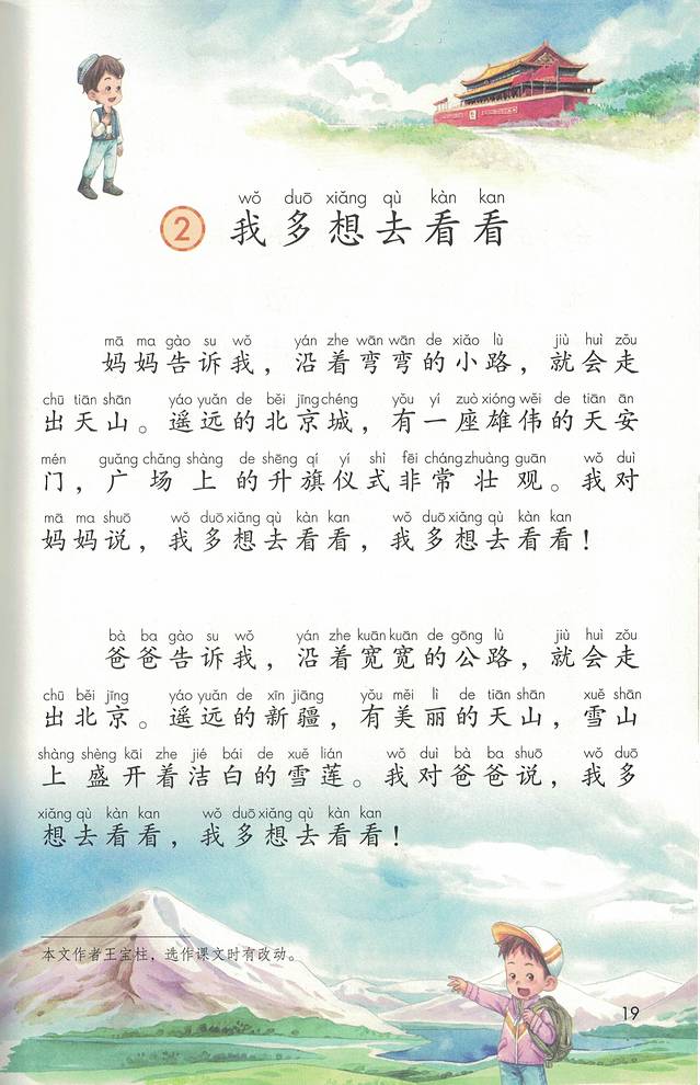 妈妈告诉我,沿着弯弯的小路,就会走出天山。遥远的北京城,有一座雄伟的天安门,广场上的升旗仪式非常壮观。我对妈妈说,我多想去看看,我多想去看看!