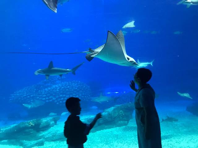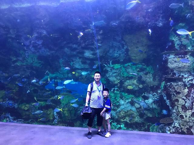 接着就是在大厅楼梯上面的平台里是海景区,这个离大玻璃窗就远一点了,再接着就是深海区,这个跟海底区和海景区不在一起,这个区是在海底隧道那边,这些区域是相通的,进去之后可以自己随便逛一下,拍拍照,相比白天的人山人海,这片刻的安静还是非常值得珍惜的,孩子在里面也可以自由的奔跑,反正大部分都是带孩子住,小孩特别喜欢