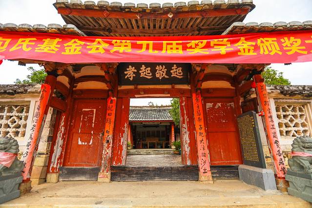 大多是明代中期的家族祠堂建筑,属于包氏家族祭祀祖先和先贤的场所。记录着家族的辉煌与传统,是家族的圣殿。作为家族悠久历史的象征与标志。宗祠的牌楼位于新修的公路旁边,公路的另一边是照壁,全由卵石砌造,牌楼系三间三楼,主体木构,红柱灰瓦。通面阔7.24米,进深二间,通进深2.7米,悬山顶,清水脊。正柱旁置形制巨大的抱鼓石,柱架顶上飞檐覆顶。