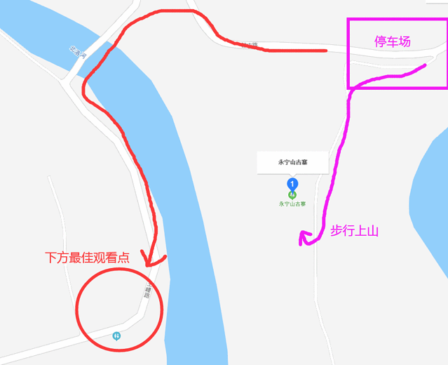 从下往上看大正面,是最佳位置,参考下图,可以开车先去下面看完,再回到停车场停好车步行上山。
