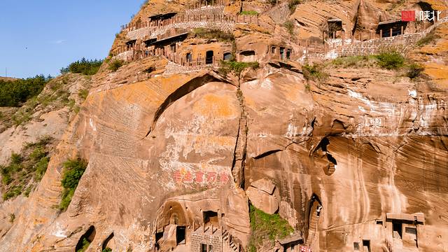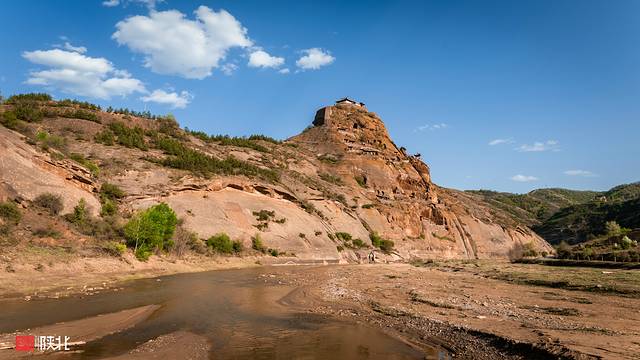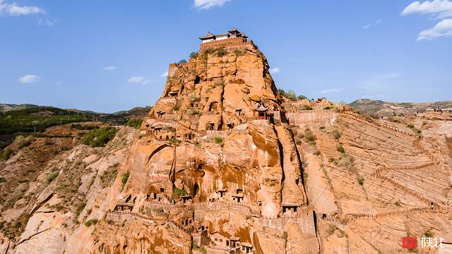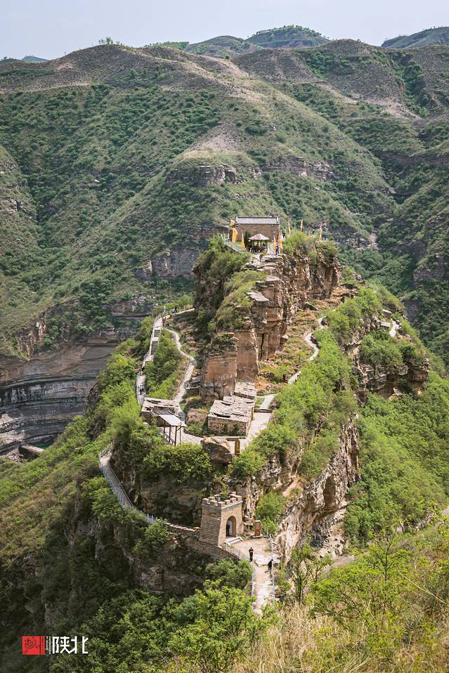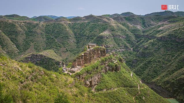 在黄土高原群山之间,镶嵌在山崖上的古寨。