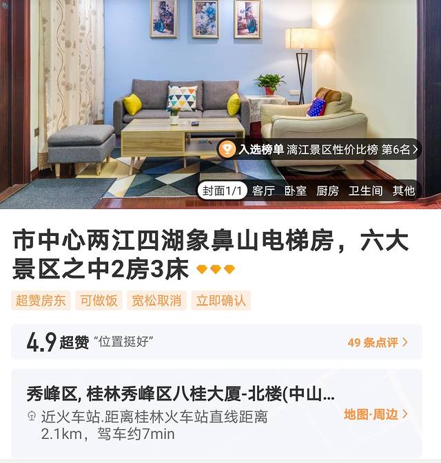 这个民宿吧,除了位置好,也没什么优势了,我是真的想吐槽🤬🤬🤬。当时订房间的时候是368元,一进屋就后悔了,感觉脏兮兮的,不像房东的晒图那么干净明亮,卫生间是蹲便,因为桂林下雨,会很严重的反味儿;主卧的床上用品也是霉味儿,还好带了旅行床单,次卧的没味道,宝宝和老妈住吧;厨房也是个摆式,生锈,发霉。真不是我黑她,我给了3.5分,房东也礼貌性的给了我2分,说我带着宝宝,把房间弄得很脏乱,没有素质。我就很无语。我看了下这家民宿的评分,每个低分都被房东“友好”的问候了。就这样凑合住了一宿。以后真的不要相信网图。对住宿有要求的一定不要来这里🙅。