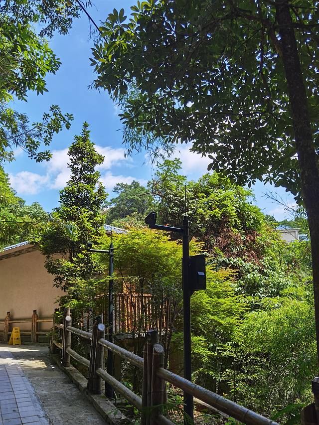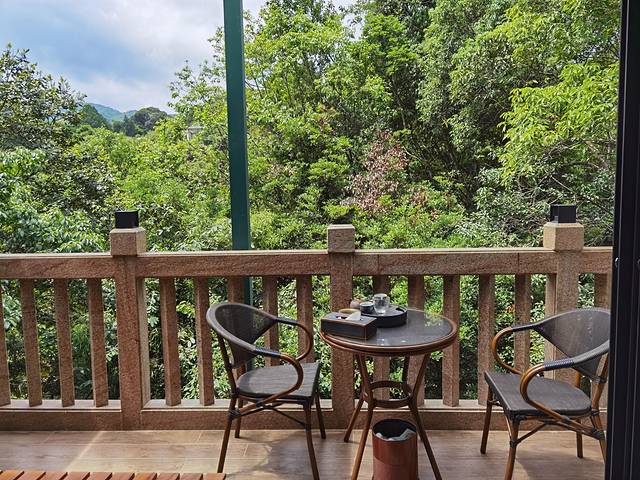 到了度假村后就得到了工作人员的热情接待,坐上度假村的车到达大堂,大堂建筑是玻璃和木质结构为主,屋顶是竹席在中间和木材在四周的设计风格,办理入住也是很快的速度,我预订的是一个基础房型,工作人员免费给我升级了一个风景好的房间。最后我们入住的是一个三楼的房间,楼道里有螳螂,知了,这真是人与动物和谐相处啊 。进入房间让我眼前一亮的是阳台外是一大片森林,天然氧吧,正值夏日有鸟叫有蝉鸣,好似有节奏的交响曲。