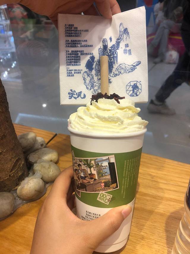 第一杯茶颜悦色喝的是凤栖绿桂,店员小哥的服务态度真是太好了,超热情又耐心,这款茶是比较冷门的绿茶,等了30分钟左右才拿到,期间雨下了又停。不过真的超级好喝,弄弄的抹茶口味,上面一层厚厚的淡奶油,不要太惬意哦!