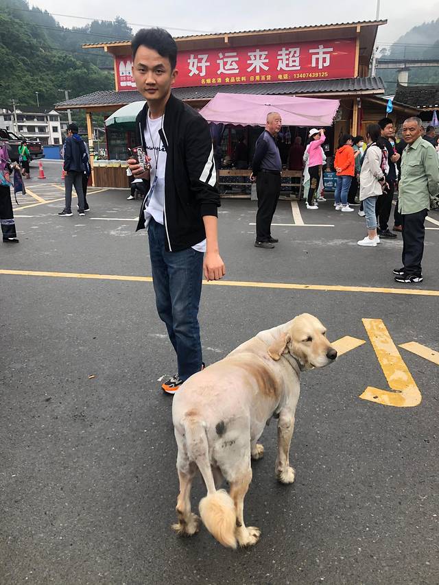 一只不怕人的大胖狗,看样子像是拉布拉多。