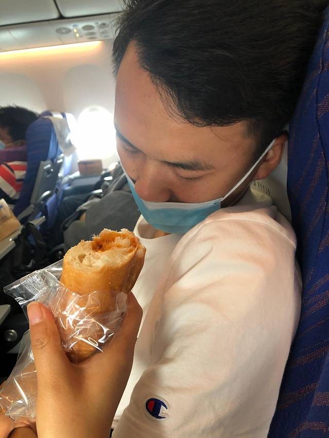 飞机起飞不久南方航空美丽的空姐就送来了面包和水,肚子饿的咕咕叫了!面包超好吃,是法棍的口感,中间夹了厚厚一层肉松,只是有些不好嚼。老公已经睡着了,算了,不给他吃了。