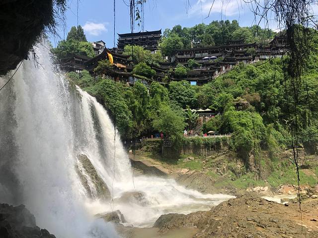 芙蓉镇最有名的就是这段瀑布断崖,游客可以从瀑布地下穿过,流水溅起的水雾打在身上凉飕飕的,彻底消去了外面的暑气,水花落下的声音震耳欲聋,三伏天在瀑布下休息喝茶肯定很美妙。