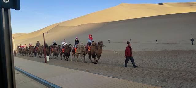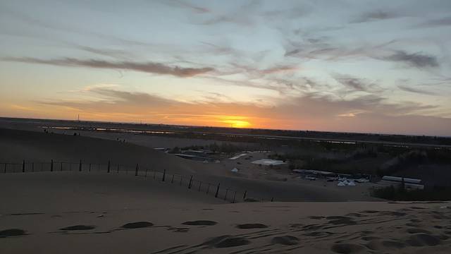 再一个下午的鸣沙山太热了,沙子都烫脚。晚上5点半来到了鸣沙山月牙泉。先做观光车去里面,20元来回。最便宜得了。沙漠骆驼🐫100元一位。还不送到山上。388元滑翔翼。888元一位直升机。有钱人还是有的。滑翔翼好多人坐的。真好。不想去沙漠露营的游客也可以在鸣沙山月牙泉这面的沙漠玩。都一样的沙漠,只不过是两面而已。一样玩的。不过对于我们来说沙漠已经失去最开始乐趣了。月牙不到晚上,不靠灯光'照耀感觉还是那样。不过确实是月牙形的。所以大家可以晚点去,等到太阳快落山的时候看能很好看。山上15元一瓶香水梨汁。所以上山的时候多带点水去,这面太干燥了。容易脱水。景点里面的纪念品都是可以讲价的。就比如说199的可以讲到150。