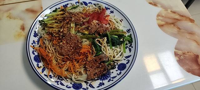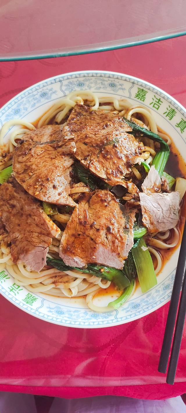 晚上9点多才到酒店。10点才出来吃今天的晚饭。但是真的超级好吃,回味无穷的面条🍜一碗牛肉拌面14元,好多的菜和牛肉。物超所值啊(*∩ω∩)