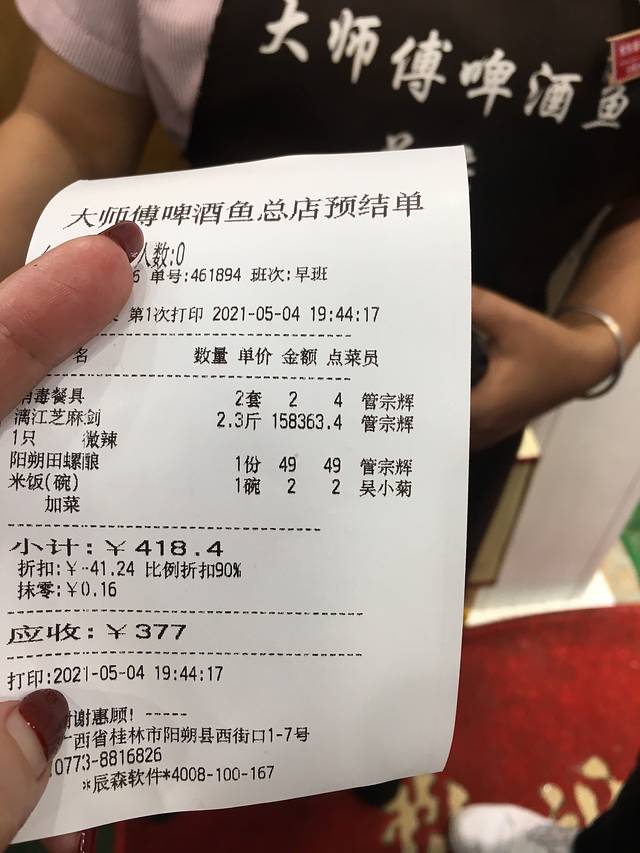 晚上吃了一顿开心的非常开心的啤酒鱼,大师傅啤酒鱼(总店),一定要吃他家味道非常好的,我们点的啤酒鱼 和田 螺酿,还有米饭,菜量非常足,酒店还给了我9折的打折卡,一点点小贵377元,不过真心值得尝试哦!