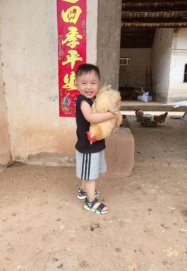 儿子第一次碰到活鸡
