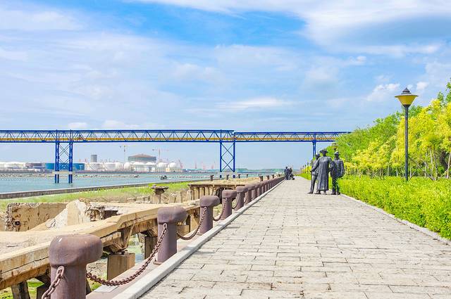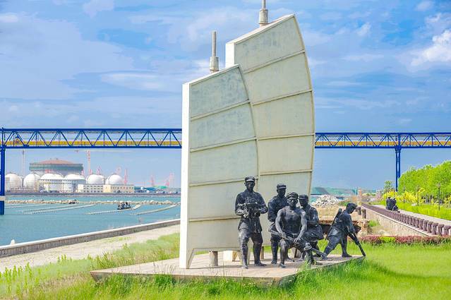 步入龙口港内部,当年建设的码头还历历在目,码头旁边还有一些很有纪念意义的雕塑,诸如1945年9月到11月,挺进东北的胶东部队在黄县龙口、蓬莱栾家口集结登船的。