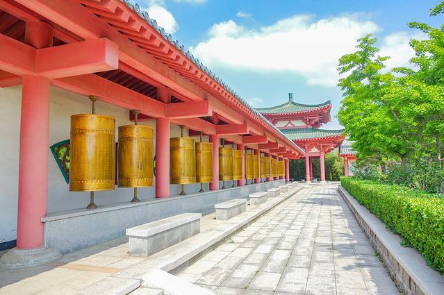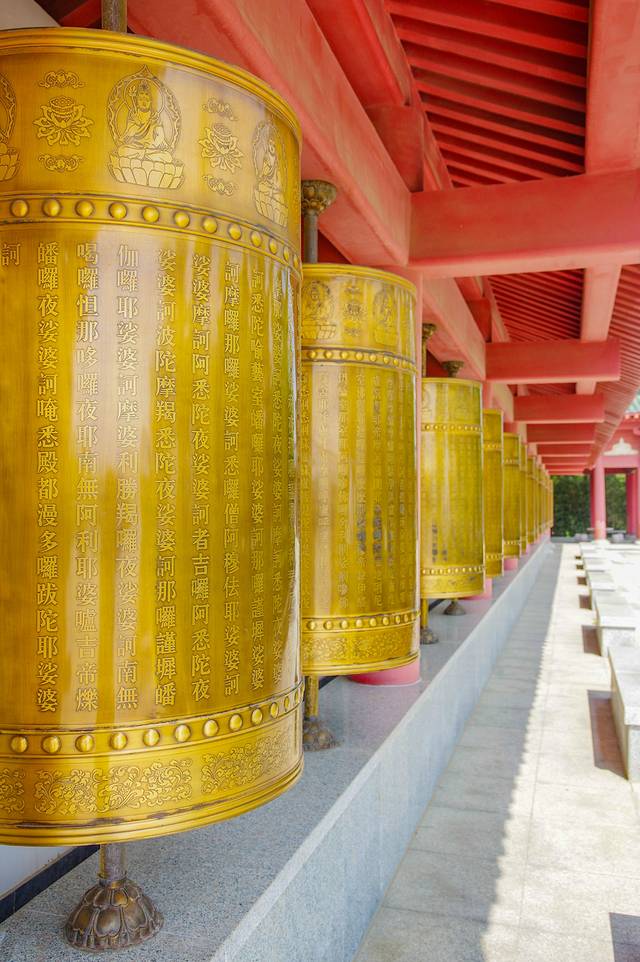 ②华严世界、又称华藏世界,是莲华藏世界的简称,是释迦如来真身佛毗卢遮那佛净土之名。 步入广场,广场正中央耸立着一处动感音乐喷泉,喷泉的中央还有着莲花宝座。广场周边还有着转经回廊,在这里边走边祈福好运吧。